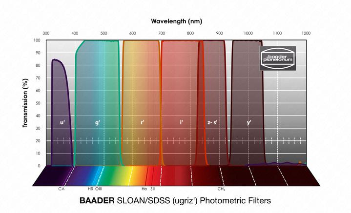 Sloan, aptos también para fotometría pero no muy usados. Al igual que los Stromgen, no solapan entre sí pero son de mayor ancho de banda, con lo que transmiten más luz. Dado que los resultados obtenidos con estos filtros pueden transformarse a los obtenidos con los tradicionales de Johnson-Cousins con unas fórmulas sencillas y que los profesionales siguen prefiriendo este último sistema, no me extenderé más con ellos.