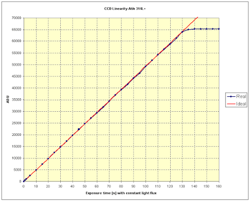 En cualquier caso, una cosa que deberemos hacer es comprobar su respuesta lineal para saber hasta dónde podemos exponer. Todas las CCD's, aunque tengan una respuesta lineal, suelen mostrar desviaciones cerca del límite de saturación (en una CCD de 16 bits, recordemos que la saturación son 2