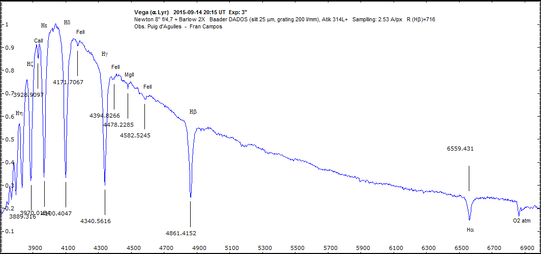 Pero funciona).Las primeras pruebas las he hecho con Vega: ya desde el primer momento constaté la enorme diferencia que hay entre el DADOS y el SA100. Mientras que con el segundo apenas paso de ver 4 bandas de Balmer, con el primero se definen de manera muy clara y puedo contar 10 bandas perfectamente y una resolución superior a 700, además de mostrar con claridad la línea del Ca II.