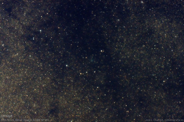 El cometa 22P/Kopff fotografiado el 6 de Noviembre de 2015 situado entre las constelaciones de Sagittarius y Ophiuchus justo en plena Vía Láctea, puede verse en el centro de esta imagen con un brillo entorno a la magnitud 11 y una pequeña coma azulada de sólo 2 minutos de diámetro.