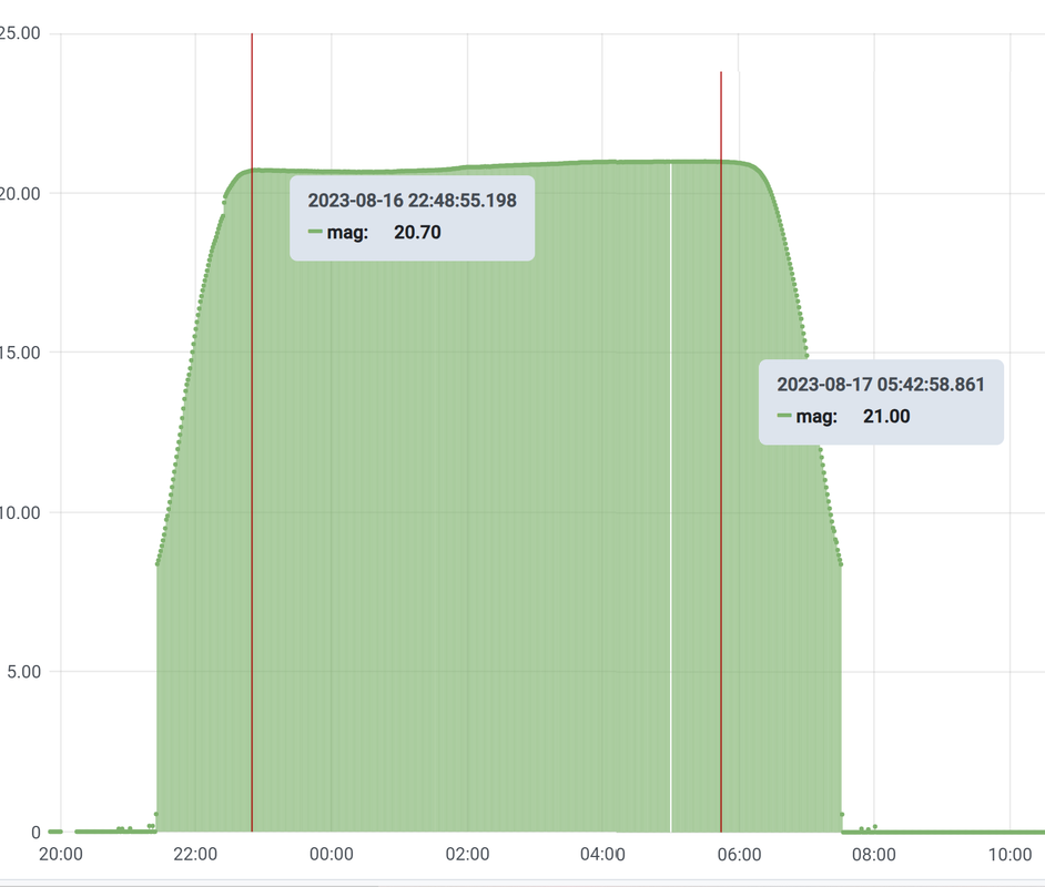 Y a estas cuestiones fundamentales que habéis comentado debemos añadir que la calidad del cielo se modifica a lo largo de la noche. Sirva como ejemplo los datos del fotómetro que tengo instalado en el jardín. Son los datos de esta pasada noche -17 de agosto-.