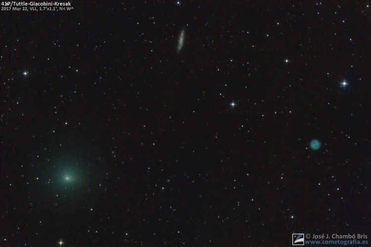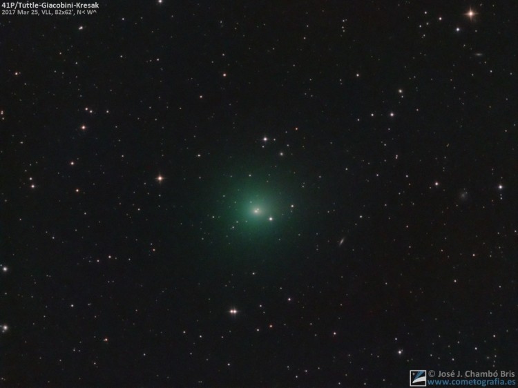 El cometa 41P/Tuttle-Giacobini-Kresak fotografiado el 25 de Marzo de 2017, cinco días antes de su máxima aproximación a la Tierra a una disncia de 0,14 U.A. Su coma verdosa muy difusa se extiende con un diámetro de unos 20 minutos de arco, brillando cerca de la magnitud 7,5.