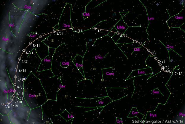 : El cometa ahora se encuentra entre los límites de Cáncer y Leo, se irá moviendo hacia el norte, pasando por el Lince a inicios de marzo, y por la Osa Mayor a finales del mismo mes. Durante el mes de abril se moverá ya más hacia el oeste, pasando por el Dragón, y posteriormente se moverá hacia el SW, cruzando la constelación de Hércules durante mayo, y entre los límites de Serpens Cauda y Ofiuco durante junio y julio.