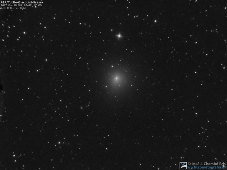 El cometa 41P/Tuttle-Giacobini-Kresak fotografiado el 18 de Marzo de 2017, presenta una condensación central definida alrededor de la cual se extiende una difusa coma con un diámetro de al menos 12 minutos de arco. Hacia el sureste (abajo a la izquierda) se detecta el trazo de una tenue y corta cola iónica.