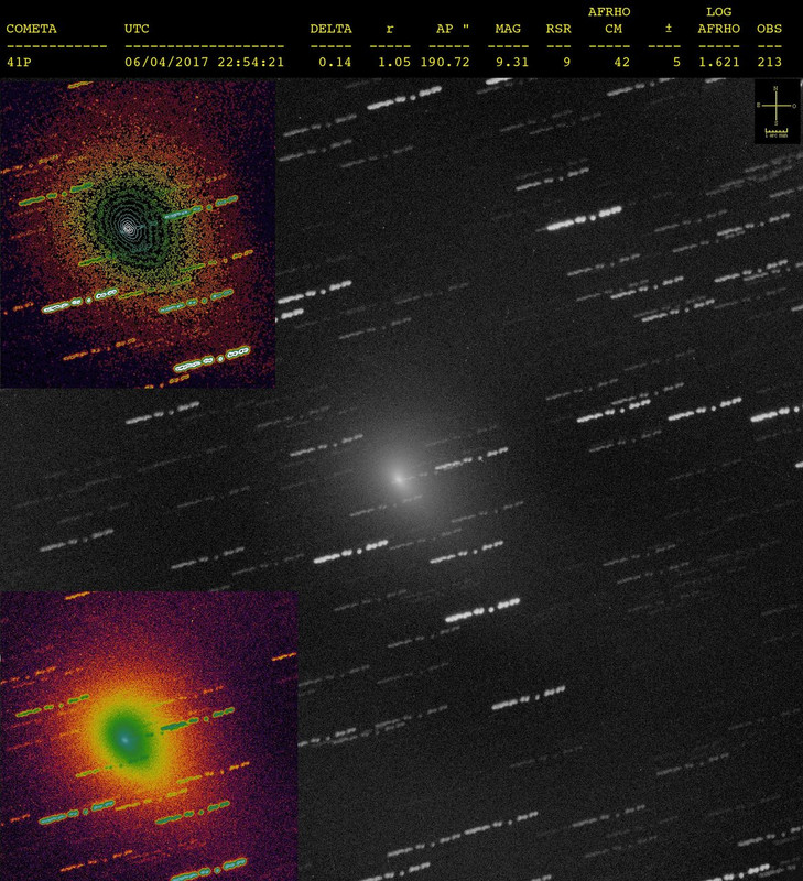 yo precisamente en mi agrupación hicimos una salida a cazar los cometas de Hercules la pasada noche del 22 al 23 de abril, y los pillamos tanto en visual como en foto.....precisamente este el 41P en visual con un Dob 8" se podía intuir perfectamente su color verdoso con un diámetro bastante grandecito