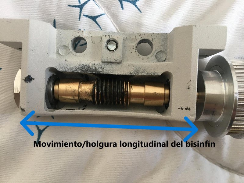 Ésta tiene varios pasos de rosca y poco a poco la fui ajustando hasta que desapareció la holgura, que a día de hoy me pregunto si no hubiera sido necesario desmontar todo el bisinfín y hacerlo directamente soltando tan solo esta rosca aunque tampoco fue demasiado esfuerzo soltar el bisinfín y creo que al haberlo desmontado me hizo comprender mejor el origen del problema de la holgura.