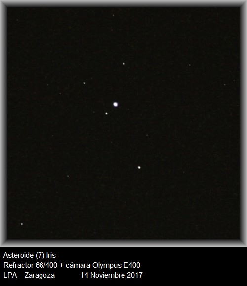 Según el programa Cartas del Cielo, a una distancia de 130.7 millones de km se encuentra el asteroide Iris, que con una mv de 7,2 es visible con facilidad en las