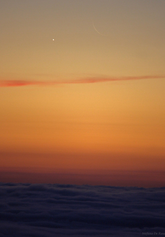 por Stephano da Rosa: separadas por menos de un grado, las dos medias lunas se ciernen sobre un mar de nubes. La imagen fue grabada desde un puerto de montaña alpino no muy lejos de Turín, Italia