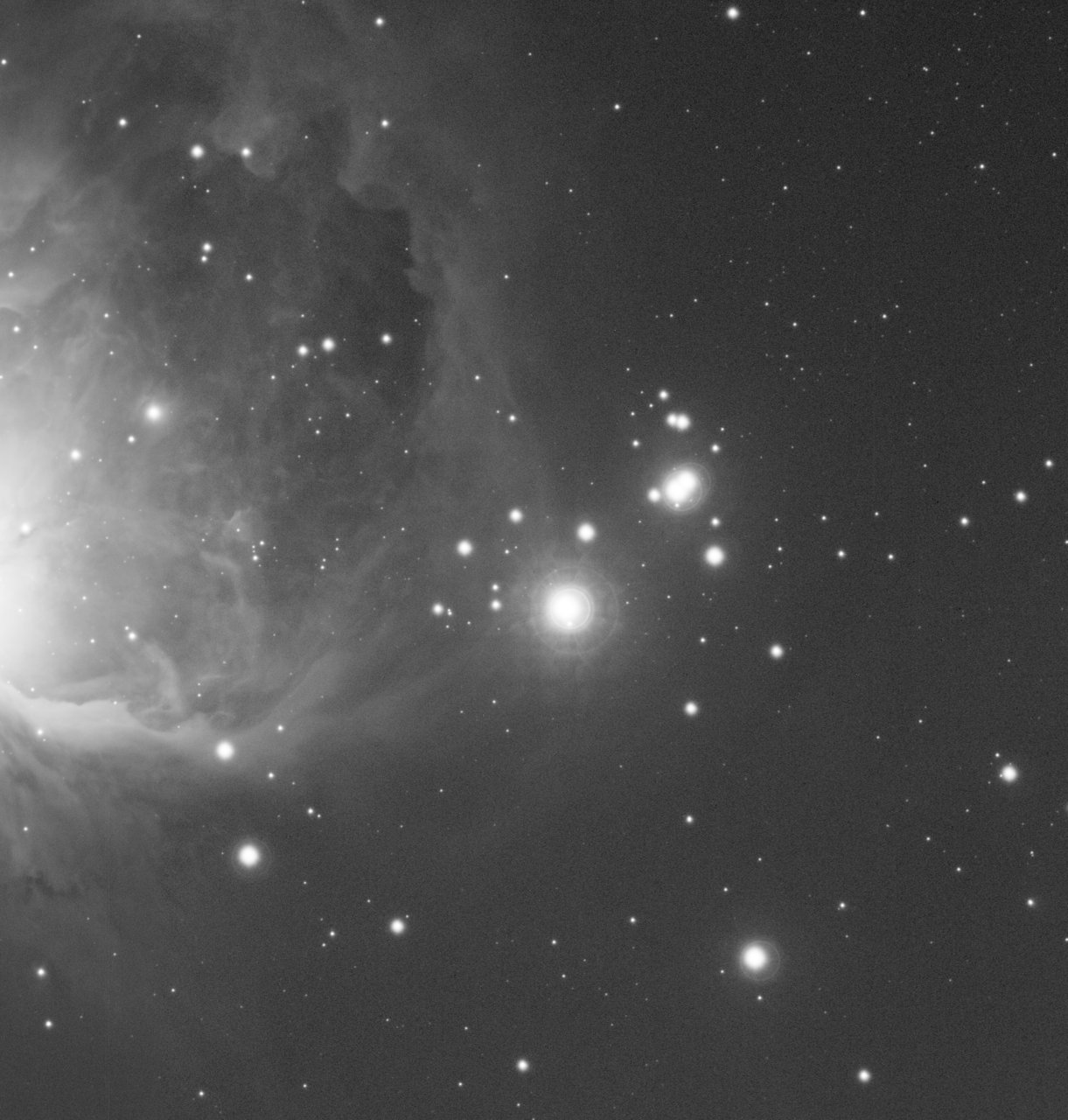 Adjunto una captura de la nebulosa de Orión que capté en diciembre de 2021. Son ocho tomas de un minuto en cada una de los filtros. La imagen esta estirada con STF sin ningún otro retoque. No hay calibración con darks, flats, ni bias.