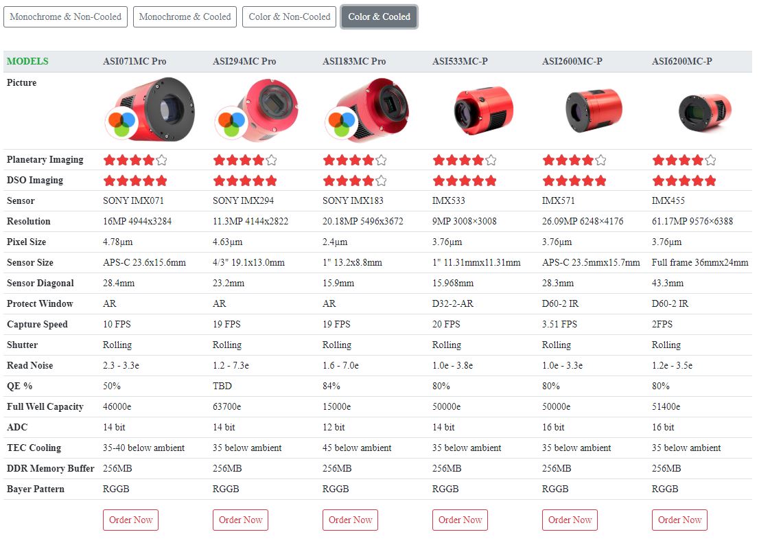 Una comparativa rápida de las cámaras a color refrigeradas de ZWO: