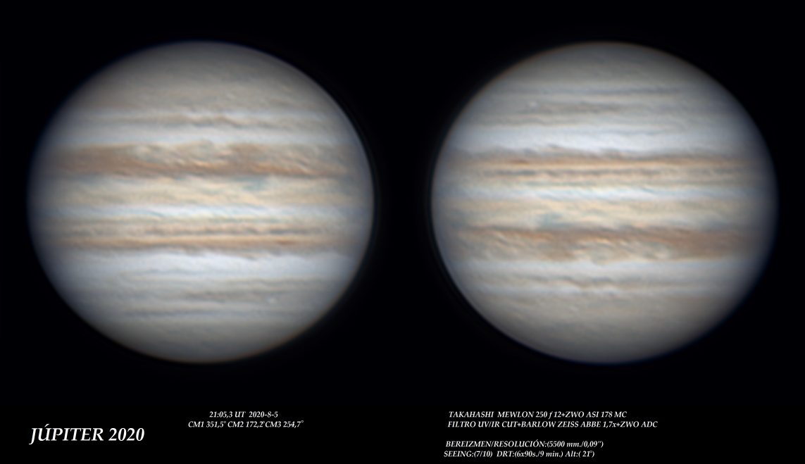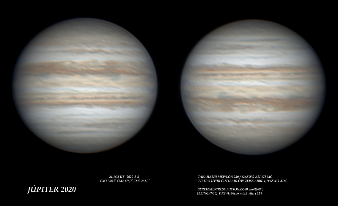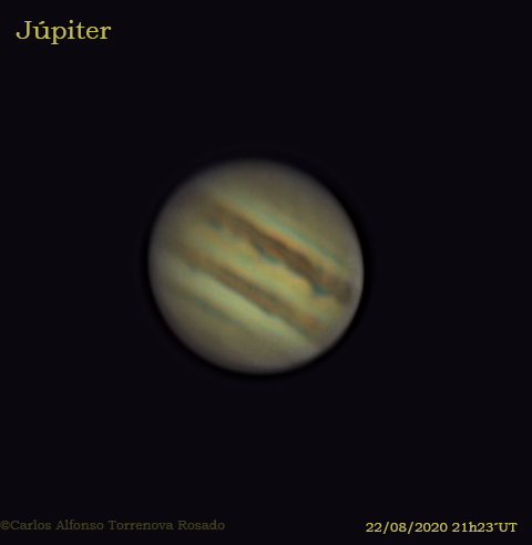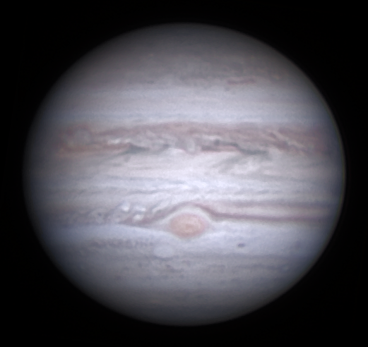 Carl, buena imagen , con esa sombra de Io. Si no te importa he trabajado un poco tu imagen. Estoy empezando a usar un programa para procesar imágenes planetaria, AstroSurface, y un poco de practica me viene bien. Por ahora me gusta el resultado que da.
