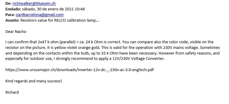 Lámpara RELCO SC480 para calibración de espectros. leí que Miguel había utilizado resistencias de 20 KOhms, me llevé las tres que tenían y que, por cierto, son realmente enormes...