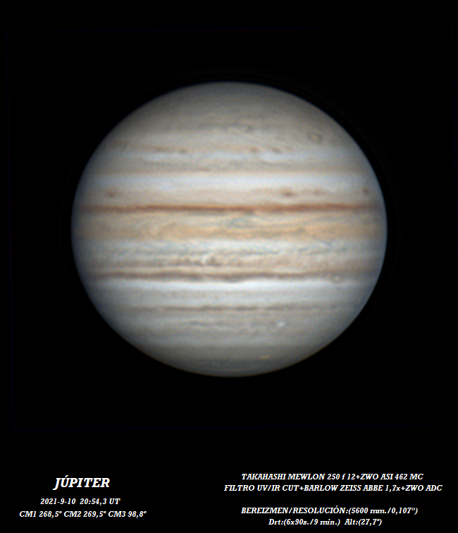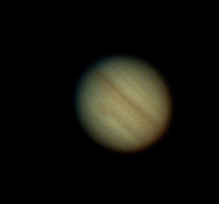 Hola compañeros, aquí pongo 2 fotos de Jùpiter en una composición de dos momentos diferentes de la noche de este pasado Sábado, en que las nubes pasaban y me apagaban el planeta de vez en cuando, que temblaba bastante, el caso es que por momentos veía un montón de detalles y me emocionaba pero se difuminaba a ratos, la diferencia en el tiempo es porque llegó un momento en que se tapo del todo y temiéndome lluvia me puse a desmontar, pero cuando ya había quitado la cámara los cables y había movido el tubo, va y aparece de nuevo, menos mal que la montura no la había movido todavía, así que tuve que coger un par de estrellas de calibración, montar la cámara, los cables, volver a enfocar y centrar el planeta y a captura de nuevo, creo que la foto ha mejorado con respecto a las anteriores a pesar del seeing malillo, ya me diréis, son dos videos de 3 minutos, los que me parecieron mejores según la grafica de Autostakert, los demás irán a la basura no me valen para hacer una derrotación, espero que os guste, pongo también un fragmento de uno de los vídeos en gif para ilustrar como veía el planeta, a ver que os parece el como se ve y la relación con lo que he sacado.