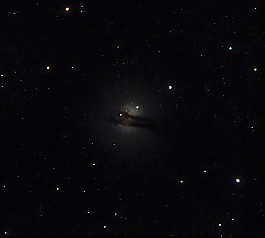 La imagen no es buena... OK lo cierto es que ¡es un asco! Pero me parecía tan sorprendente poder pillarla por los pelos que me ha parecido lo bastante curioso como para compartirlo. Era muy extraño. El telescopio prácticamente horizontal, alineado con el suelo. El guiado se las veía constantemente con la turbulencia del horizonte y solo pude captar 25 minutos de "algo" que destacara contra el fondo. Pero se ve la galaxia y la marca de polvo oscuro tan característica que la recorre. Seria interesante ver si desde el cielo canario hay mas juego con esta galaxia. Aquí desde la peninsula yo creía que era imposible. Ahora se que es "casi" imposible.