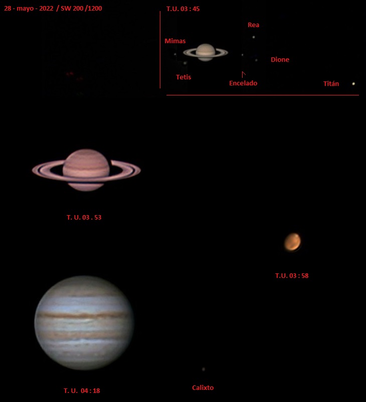 Hoy ha sido sesión de cielo profundo pero antes de desmontar he apuntado a Saturno a ver que tal. No es gran cosa por que he usado la cámara de CP pero algo a salido. Con la sv305 hubiera sido mejor pero ya amanecia y esta ha sido tomada ya con el fondo azul del cielo, es lo que hay.