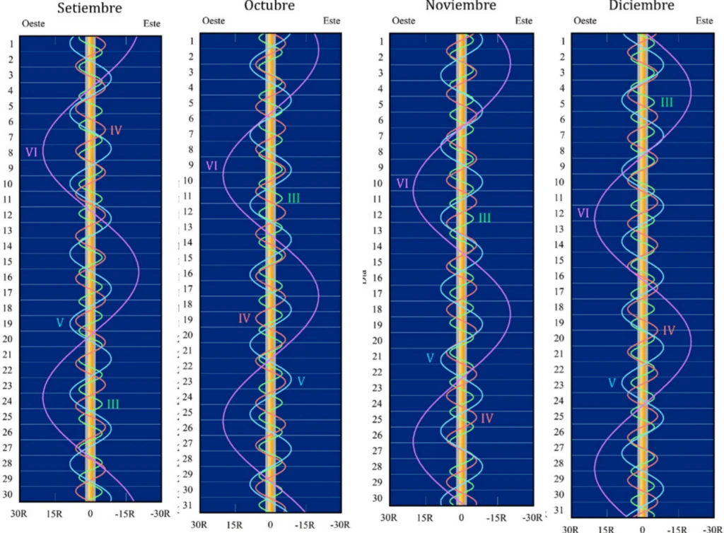 De menor a mayor amplitud, las posiciones dibujadas corresponden a Tetis (III), Dione (IV), Rea (V) y Titán (VI).