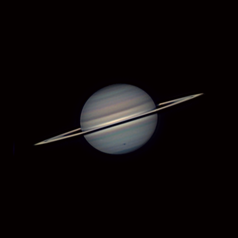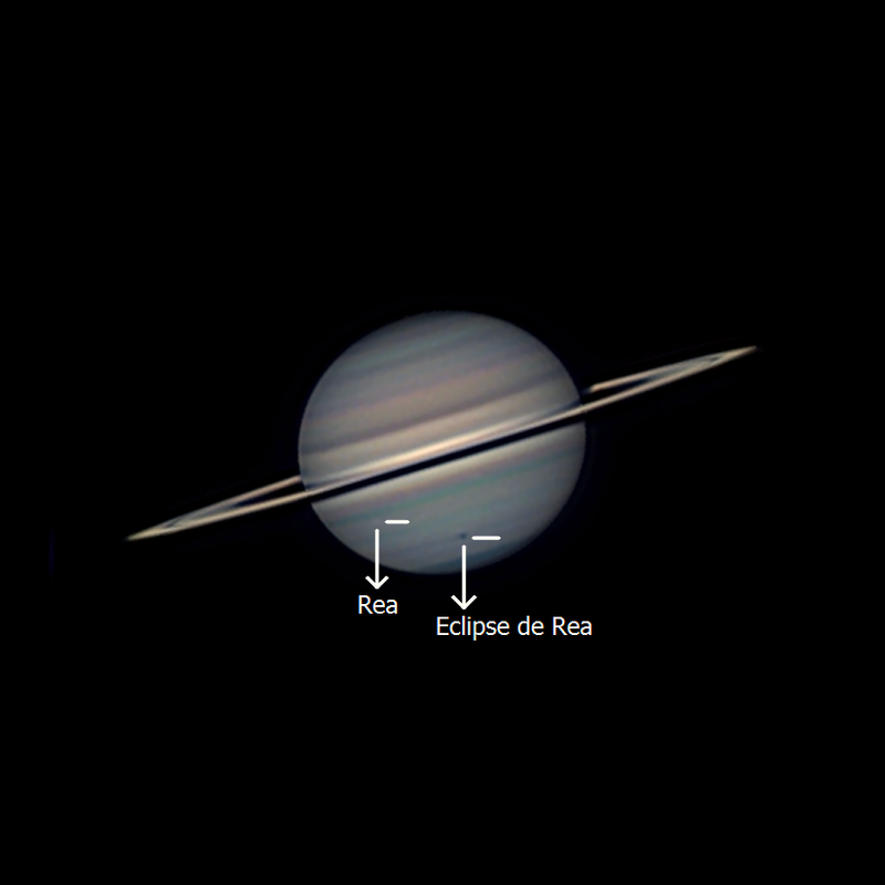 Qué pasada los tránsitos de Rhea y Dione. Yo observé Saturno este finde pasado y sólo pude reconocer a Titán y Encelado, uno a cada extremo del plano de los anillos de Saturno, con el Mak127.