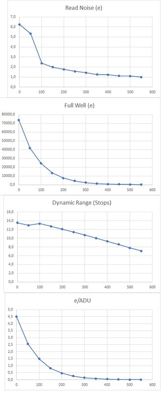 Enhorabuena por la nueva cámara. A ese precio es un autentico chollo y desde luego que compensa de sobras por la falta del concentrador USB. Los datos del chip se ven muy buenos. recuerdo que yo también analicé el sensor de mi versión 533, la Omegon. y también eran algo mejores de lo especificado. Respecto a la ganancia unitaria no tiene mas misterio que el hecho de que cada controlador asigna la escala de ganancia como le parece bien. En la mía la escala empieza en 100 mientras que en la ZWO empieza en 0. Por tanto para ambas el valor de ganancia unitaria que es de 10 decibelios se alcanza en 100 según la escala de ZWO y en 301 según la escala de Omegon pero se trata del mismo valor para ambas. Yo uso 309 para asegurarme de superar el umbral.