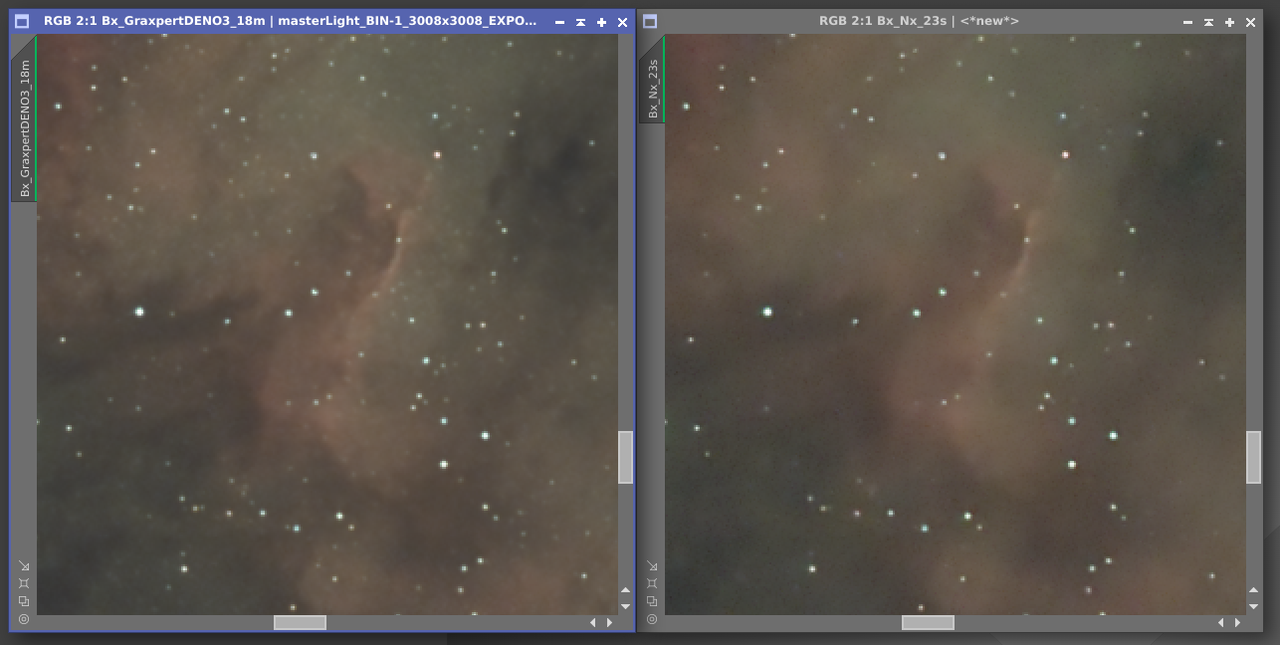 Ambas imágenes fueron procesadas partiendo del mismo apilado maestro al que se le hizo una extracción de fondo, se le paso BlurX y se ajusto el histograma automáticamente por lo que esta en modo lineal. Después se duplico y se hizo una reducción de ruido con GraXpert 3.0.0 a la de la izquierda en modo por defecto y una reducción de ruido con NoiseX también por defecto a la de la derecha. Lo que se muestra es una ampliación detallada de una pequeña zona de la imagen para ver mejor las pequeñas diferencias.