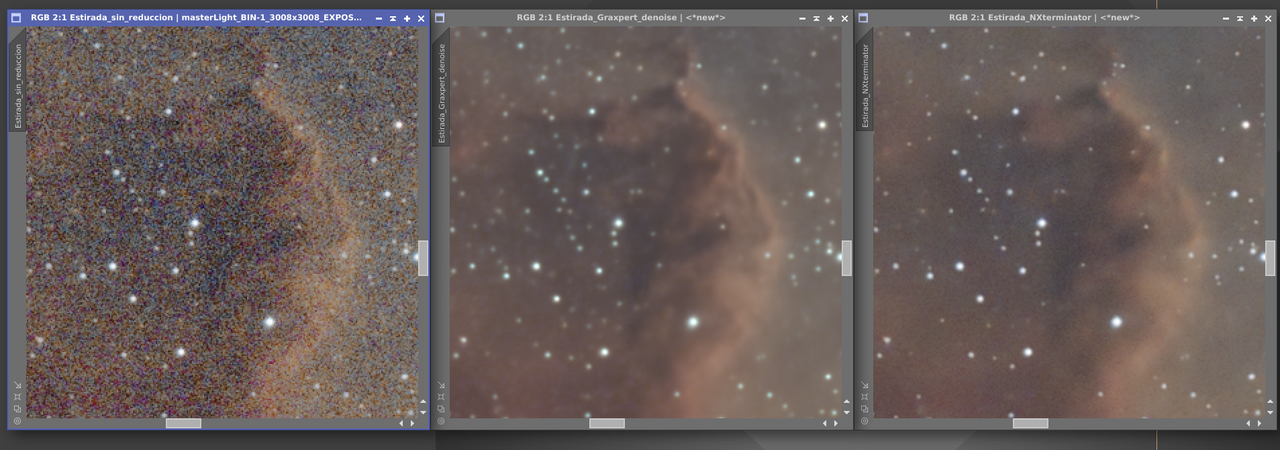 En el centro la reducida con Graxpert y a la derecha la reducida con NX. A mi criterio Graxper mantiene a salvo mas detalles de la nebulosa en las zonas debiles y muestra estrellas debiles que NX se las carga.