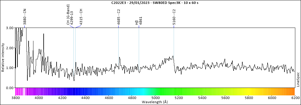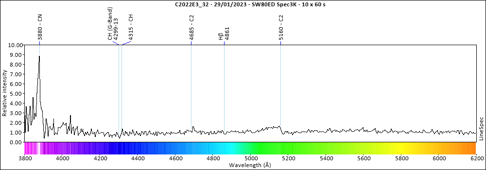 Ayer pude observar el cometa ZTF 2022E3, y sacar el espectro. Debido a la magnitud del cometa y la contaminación lumínica de Barcelona (observo desde el interior de la ciudad), el espectro contenía mucho ruido, aún así pude identificar la pronunciada banda de CN en los 3880 Å como una banda de C2 que finaliza en los 5160 Å. La banda de C2 en los 4685 Å no se aprecia con claridad, pero se observa un incremento del brillo en esta región del espectro.