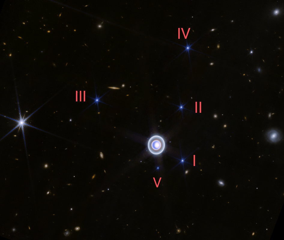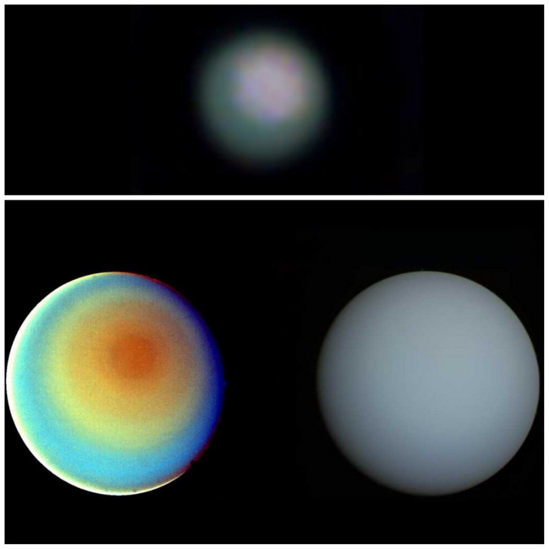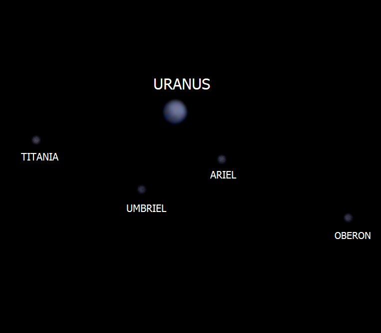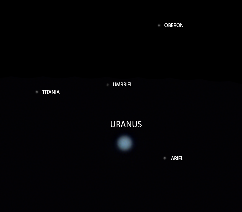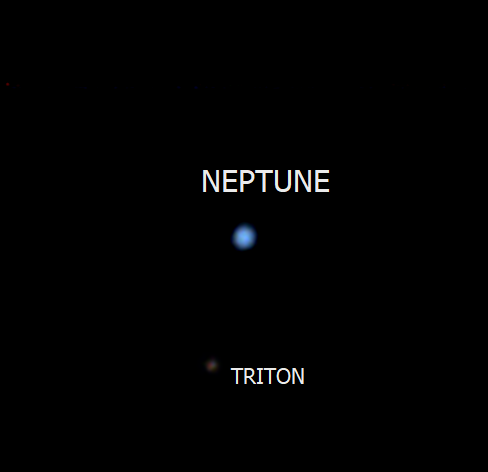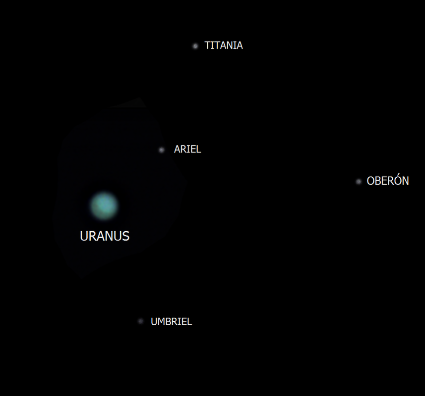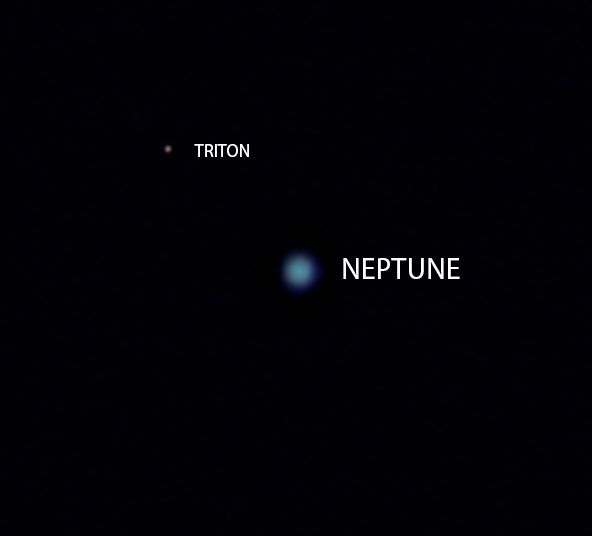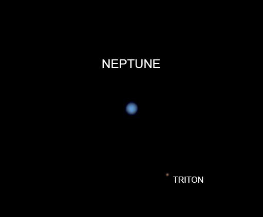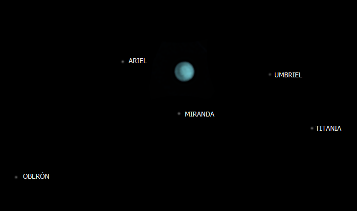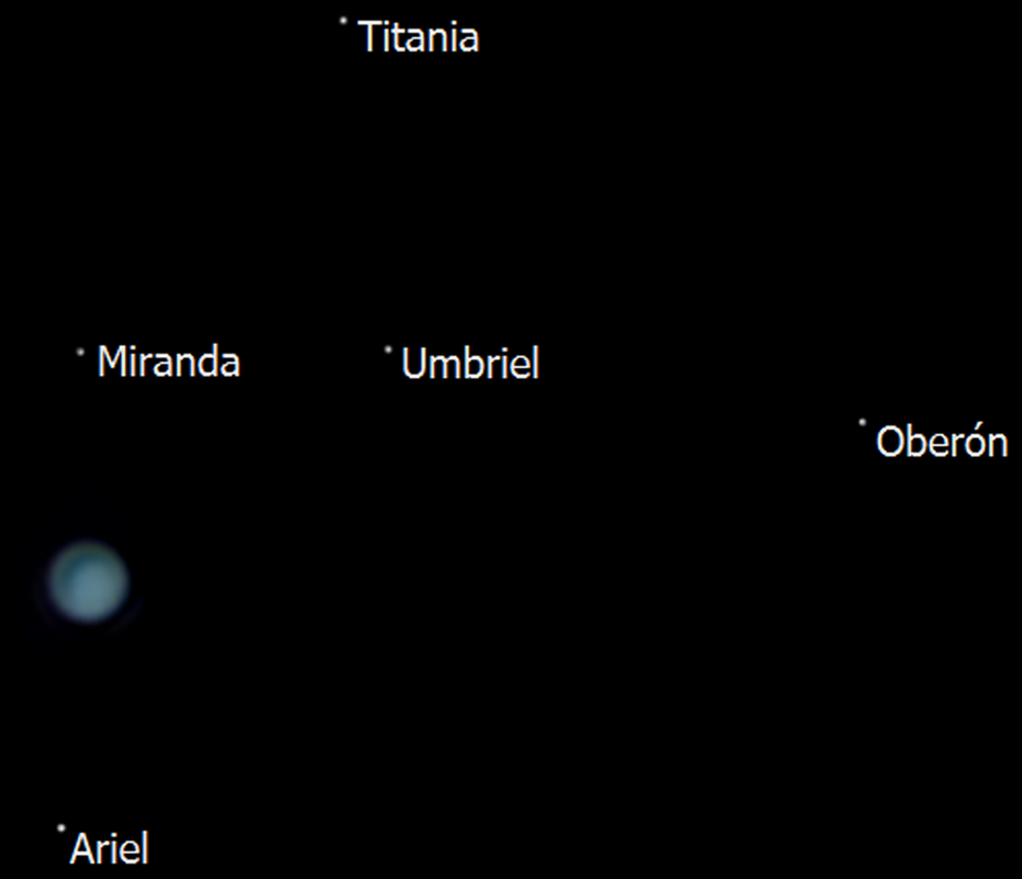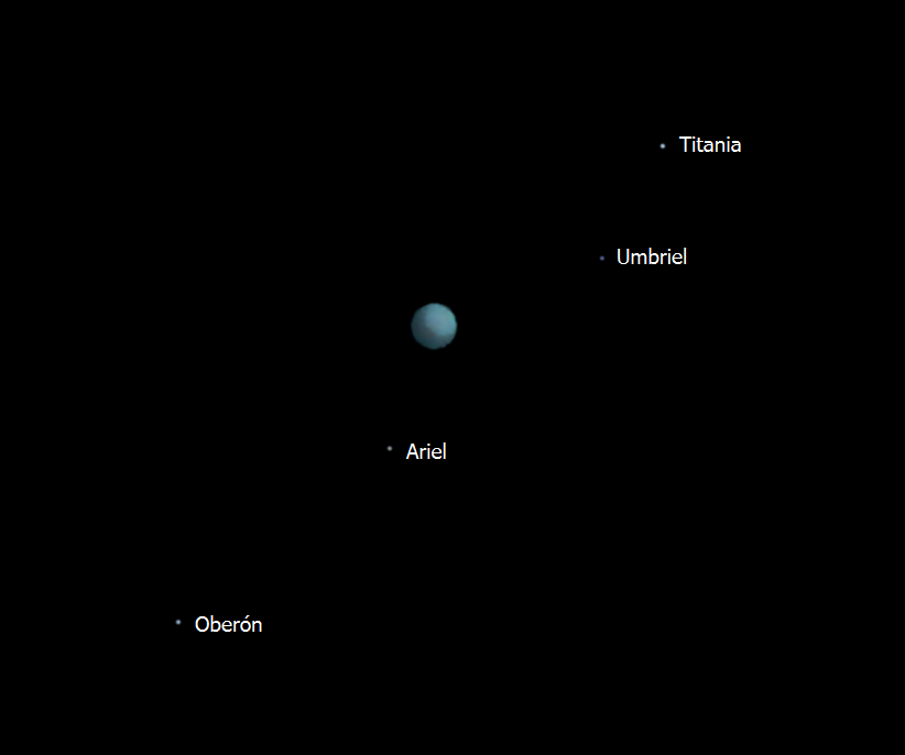 | DATOS APROX. | URANO | NEPTUNO | | Distancia al Sol | 2.9 mil millones km. | 4.5 mil millones km. | | Duración Rotación | 17 horas | 16 horas | | Duración Traslación | 84 años terrestres | 165 años terrestres | | Atmósfera | hidrógeno molecular, helio atómico, metano | hidrógeno molecular, helio atómico, metano | | Lunas conocidas | 27 lunas conocidas: Ariel, Umbriel, Oberón, Titania, Miranda | 14 lunas conocidas: Tritón, Nereida | | Número de Anillos | 13 anillos conocidos | 5 anillosy 4 arcos | | Index de color B-V | +0.56 | +0.41 | | Diámetro | 51.100 km. | 49.500 km. | | Masa / m. Tierra | 14.5 | 17.1 | | Densidad(gr./cm³) | 1.29 | 1.64 | | Velocidad de escape | 21.3 km./seg. | 23.3 km./seg. | | Albedo | 45% | 55% | | Diámetro aparente máximo | 4.08 " (2050) | 2.37 " (2042) | | Brillo aparente máximo | +5.39 mag. (2050) | +7.67 mag. (2042) |