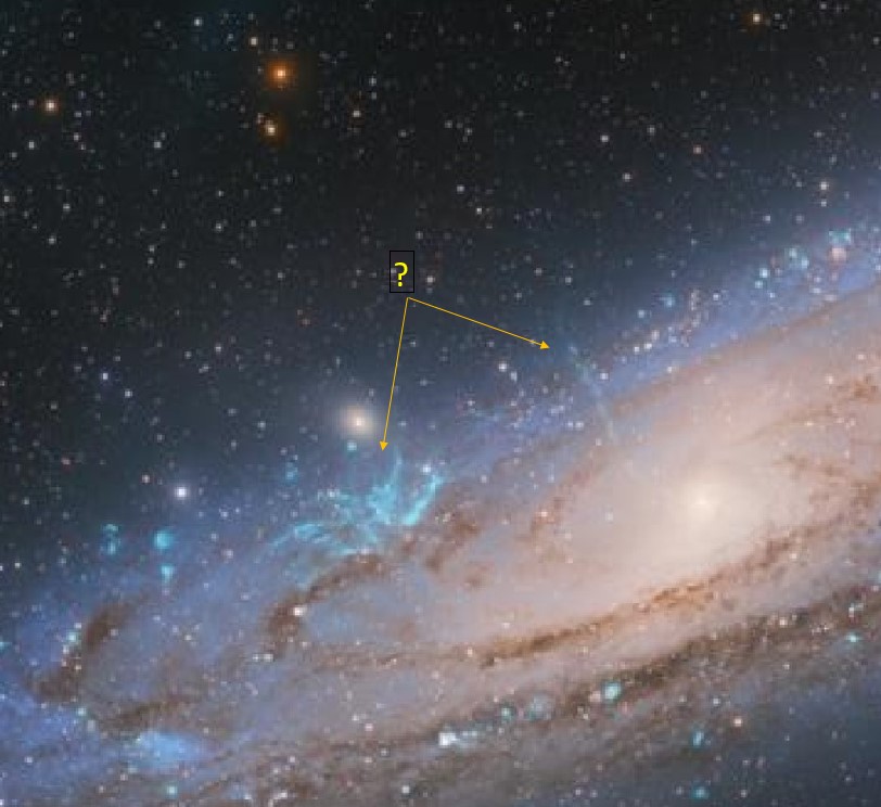 Muy interesante no solo ya por la nube de plasma, que lo es, sino también las formas que hay en el disco galáctico. Una con forma de jet saliendo del núcleo y la otra una especie de estallido azul en forma de abanico.