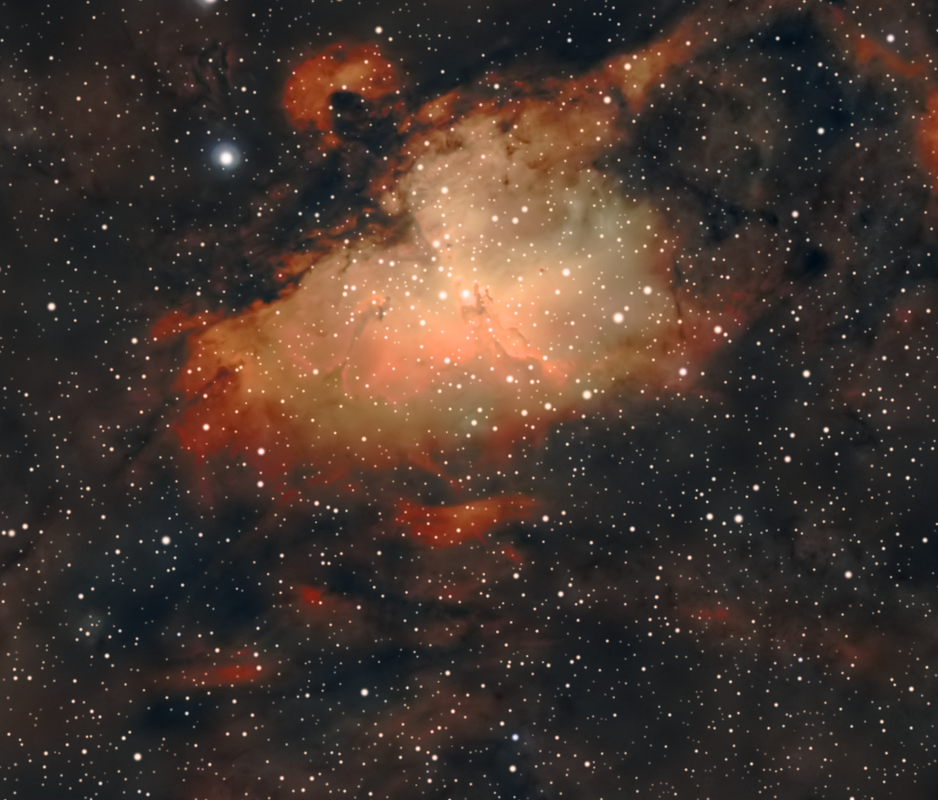 Un poco antes lo dice Álvaro. En M16 ha usado tomas de 900 segundos a ganancia 200. Eso, bajo mi punto de vista es mucho. Incluso bajo el bortle 2-3 en el que dice disparar. Claro que yo nunca he disparado bajo condiciones tan buenas y eso podría llevarme a error.