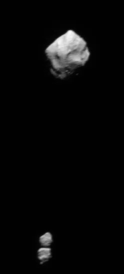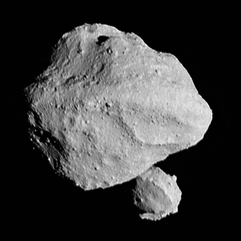 Esta imagen muestra el asteroide Dinkinesh y su satélite captados por la nave espacial Lucy de la NASA mientras se alejaba del sistema. La imagen fue tomada el 1 de noviembre de 2023, aproximadamente 6 minutos después del acercamiento más cercano, desde una distancia de aproximadamente 1630 km. Desde esta perspectiva, se revela que el satélite es un binario de contacto, siendo la primera vez que se observa orbitando otro asteroide.