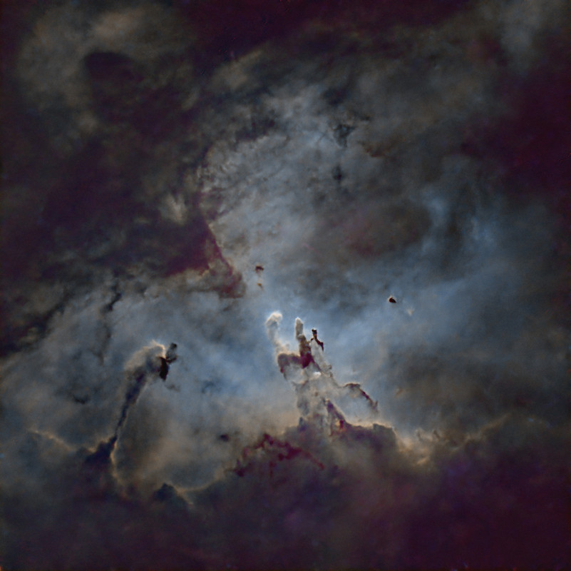 Esto es una vista previa de un trabajo que espero que sea mas completo. Esta vista del centro de M16 a través de las bandas de SII y OIII me ha gustado tanto que pese al escaso tiempo de integración he decidido compartirla.