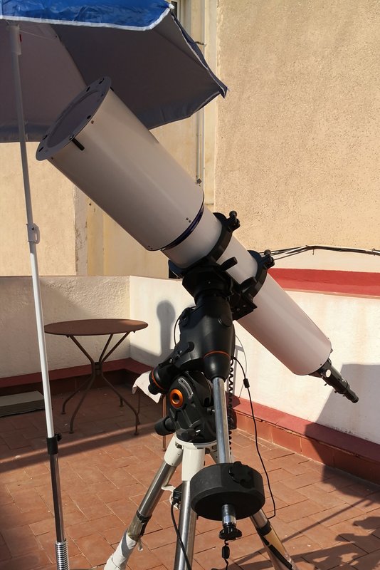 Hice sesión solar el sábado pasado día 10 con el refractor de 200, buen seeing y mucha calor. Así que me puse la sombrilla de playa y a trabajar
