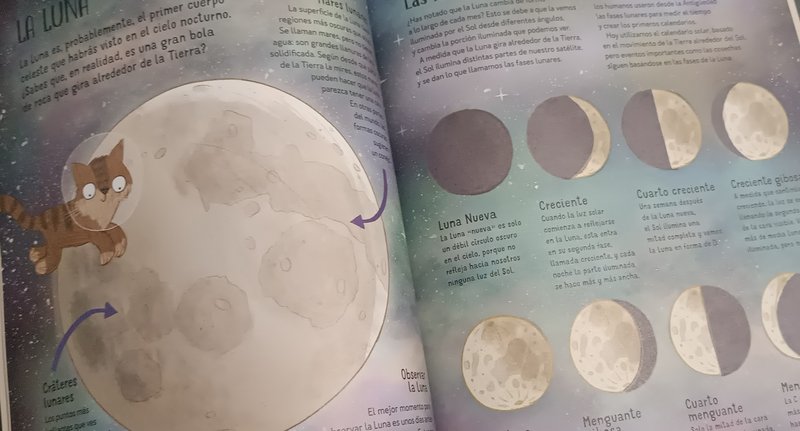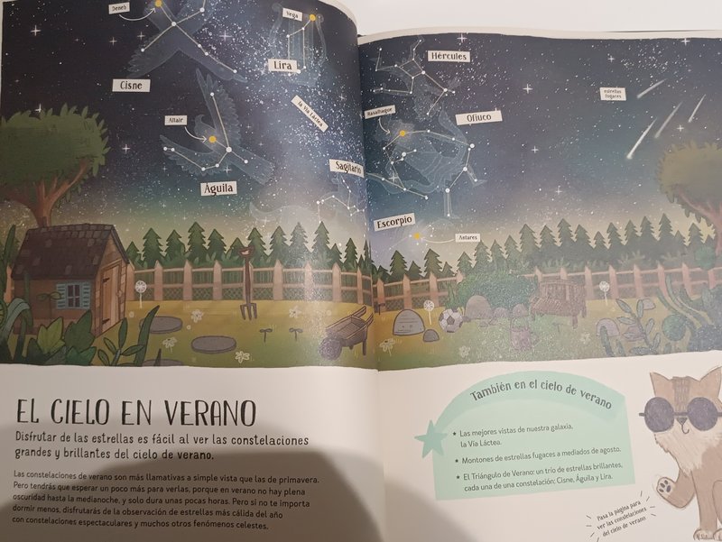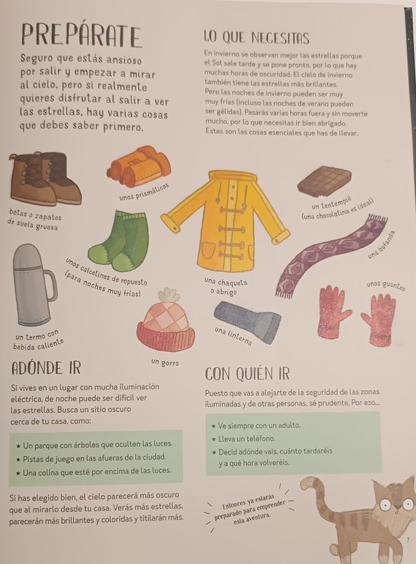 Libro con unas ilustraciones llamativas, explicaciones breves y faciles de entender. Con diferentes apartados, (las estrellas, fases lunares, que ropa llevar para observar, constelaciones según la estación del año, explicaciones sobre planetas, el Sol, las auroras,...) para acercar el Universo a mentes curiosas. A falta de conocer otros similares lo recomiendo para empezar a picar el gusanillo.