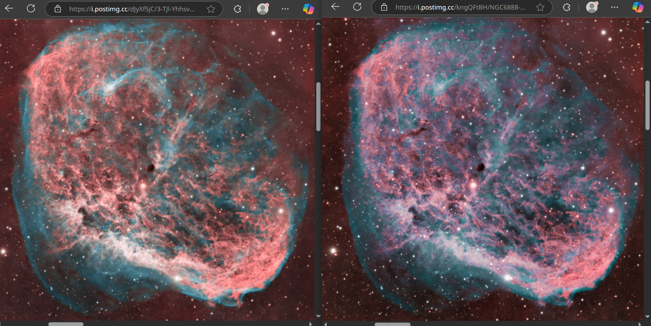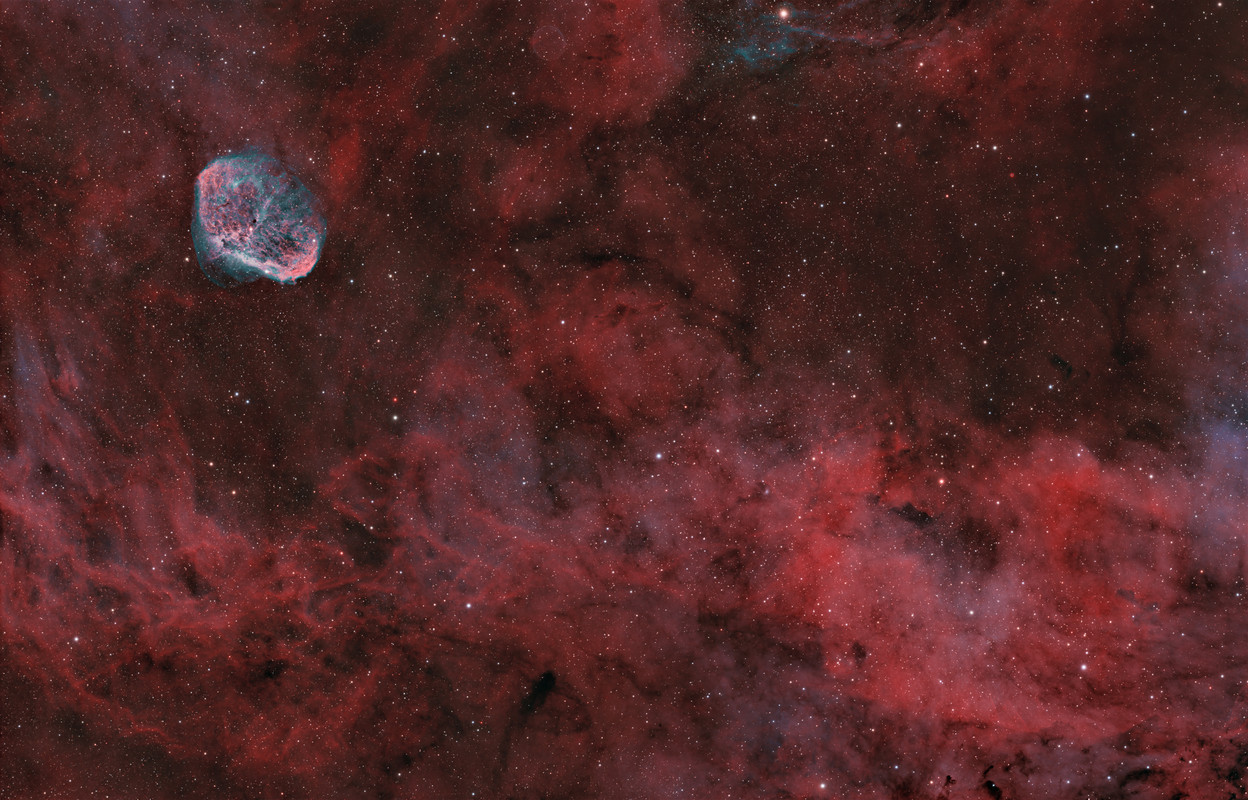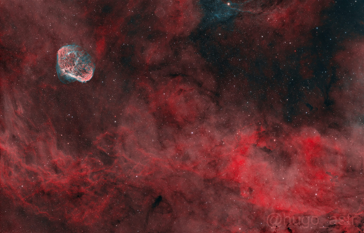 Si que es cierto que la Crescent en sí me ha quedado peor en la revisión, junto a la estructura de Oiii a la derecha de la burbuja, pero en mi pantalla veía un gradiente sin corregir y también una sobresaturación de la región inferior derecha. Aún así no es final porque todavía le voy a meter una noche más a cada filtro creo yo...