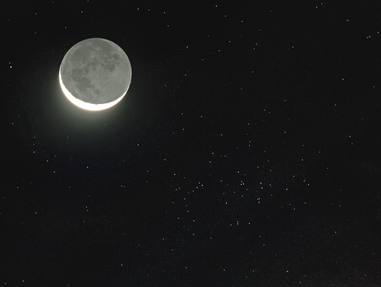 El dia 27 poco después de ponerse el Sol pudimos observar la Luna muy creca del cúmulo del Pessebre, M 44, Muy bajo y afectado por la luz crepuscular