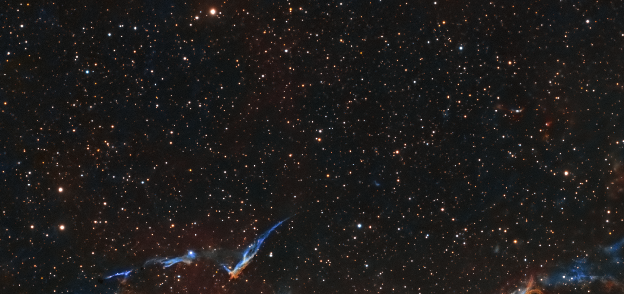 Lo que comentas del tono rojizo... no es fondo rojizo. Es que con la 585 mono se capta muchísima señal. Lo que ves por el fondo es hidrógeno muy débil que he decidido no hacer salir a superficie por que la integración no es mucha y era muy ruidoso. Si te fijas en la ampliación se ve que lo rojizo no es uniforme si no que forma volutas como el resto de los velos pues forma parte de la nebulosa.