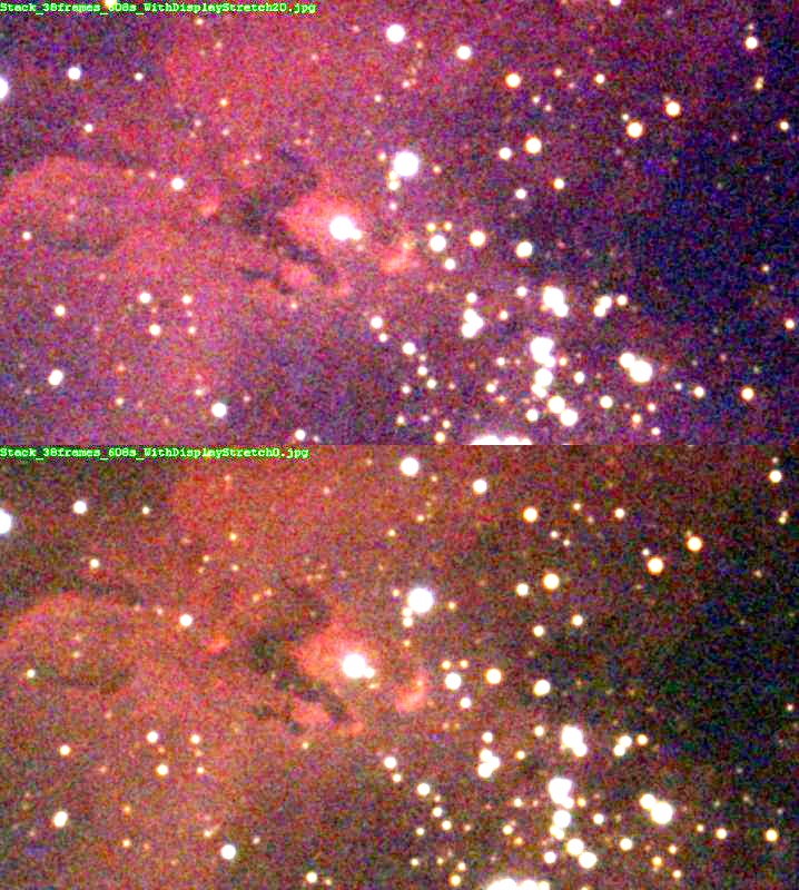 Las tomas sólo tienen flats, ningún tipo más de procesamiento, es lo que graba sharpcap al hacer el apilado en vivo, sin usar ninguna de las opciones que tiene de "mejora" de imagen, con el filtro uv/ir, sólo ajustando el histograma que igual no coincide exactamente en ambas.Tengo otras pruebas y el resultado es similar., osea no resultado (o casi).
