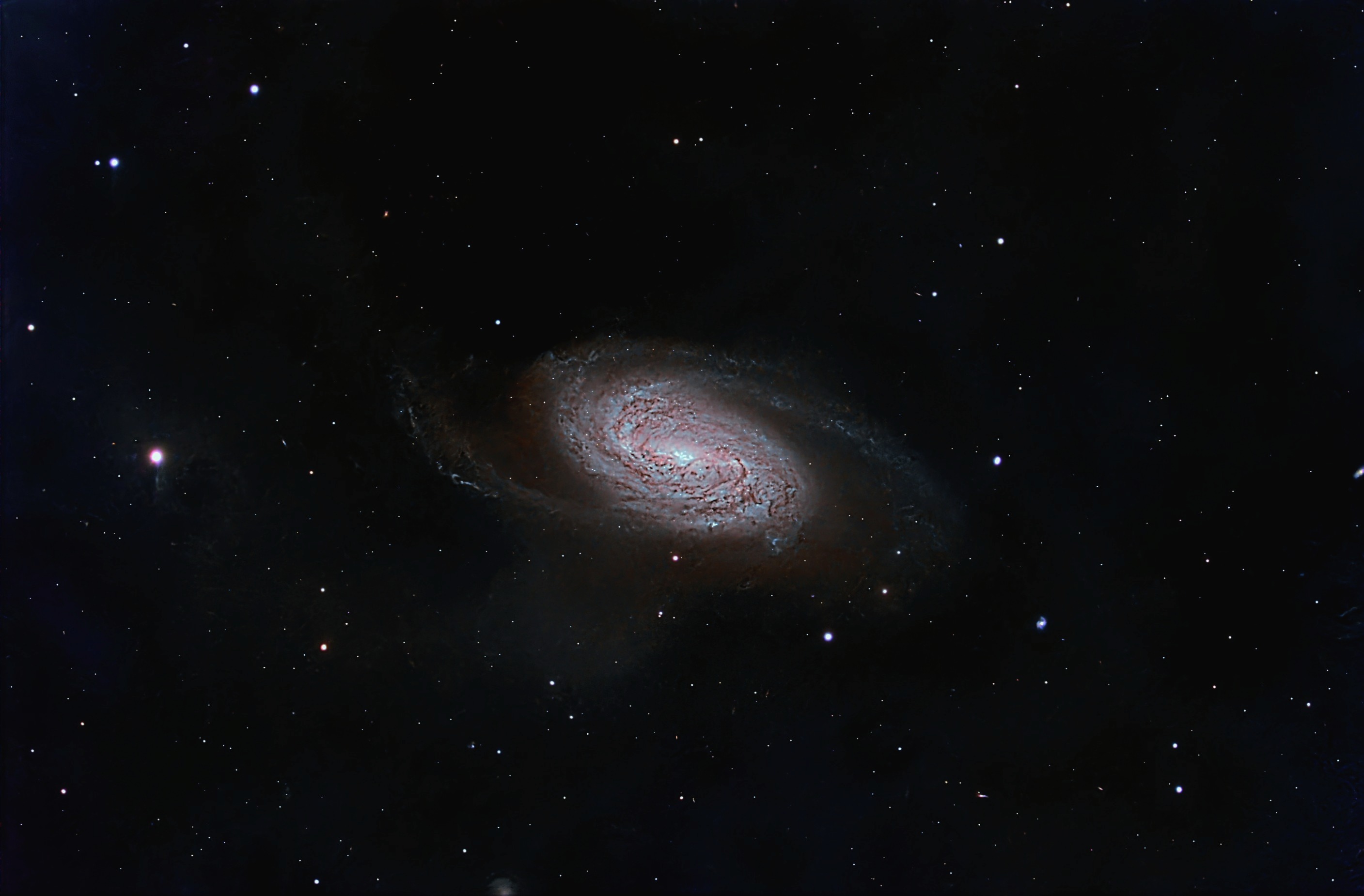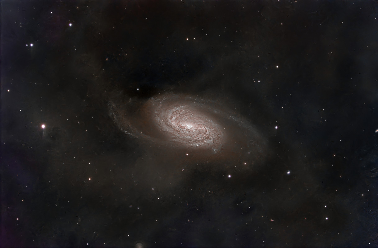 Lo que mas me llama la atencion de la imagen es la cantidad de polvo alrededor de la galaxia y con ese chorro que le sale por la parte inferior y se desplaza a la izquierda. Estoy con la mosca detras de la oreja porque no me queda claro si es polvo de la propia galaxia y de esa zona en concreto o es suciedad en el conjunto optico en el momento de tomar las exposiciones, no lo se, el caso es que nunca habia visto este objeto con todo esa nebulosidad alrededor.