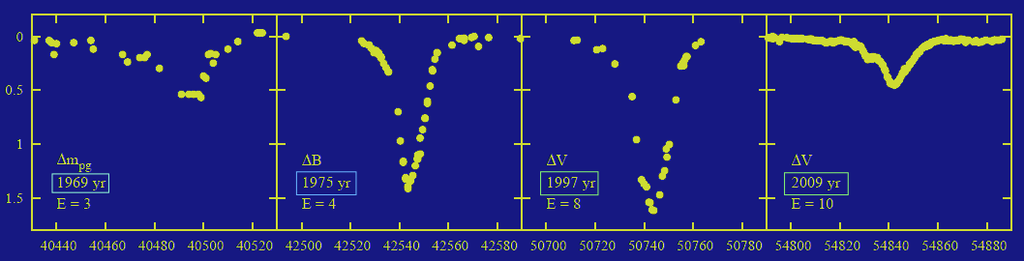 - Variabilidad episódica – Cambios en forma, profundidad o duración del eclipse entre eventos sucesivos, atribuidos a dinámica del disco o cambios en orientación/precesión.