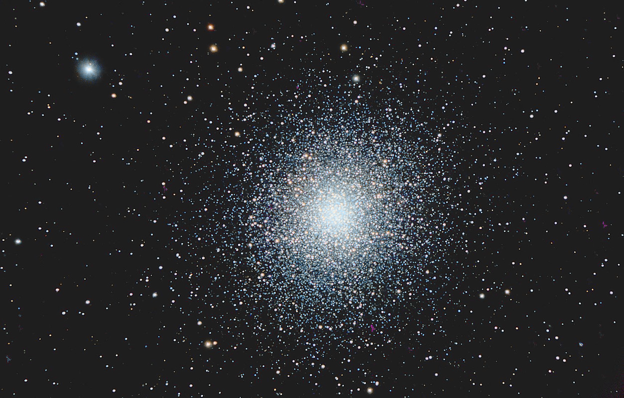 En realidad procesar cúmulos globulares con su brillante centro y abundantes gradaciones de estrellas es todo un desafío tanto para principiantes como para avanzados. Especialmente cuando se dispara con tanta focal y nos da tan poco margen de error en el procesado. Muy bien logrados los brillos de las transiciones y las estrellas en el centro. Respecto al color... algo falla. Yo veo las estrellas verdes. Y no digo ligeramente verdes si no totalmente verdes. Comprueba el ajuste de color de tu monitor pues posiblemente tengas virado algún tono. A ver que dicen los demás al respecto pero para mi la tonalidad verdosa es muy evidente. Ojo si has usado para procesar un portatil gaming con teclado retroiluminado en verde. Durante un tiempo yo usé uno y descubrí que modificaba mis sensibilidad visual dejando extraños colores en los planetas -entonces hacia mas planetaria- que procesaba. Color aparte, el detalle esta muy bien.