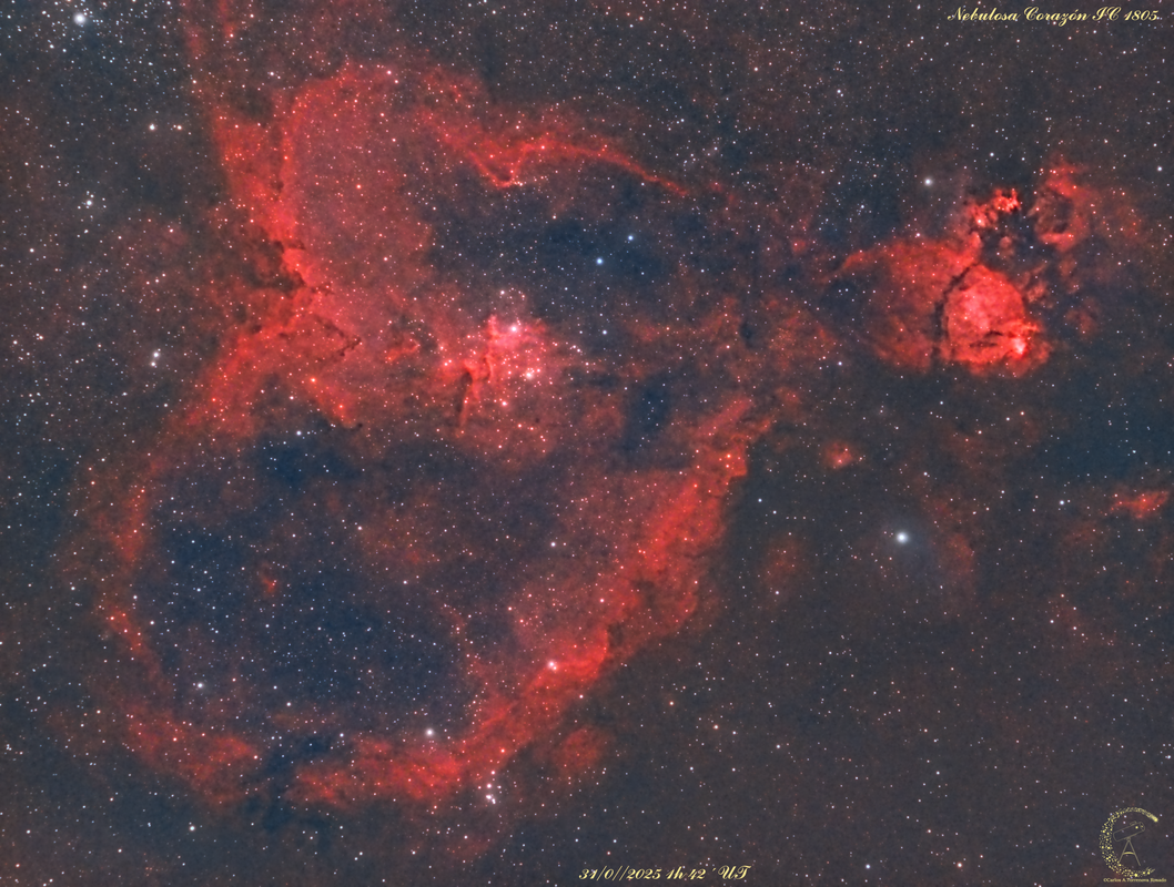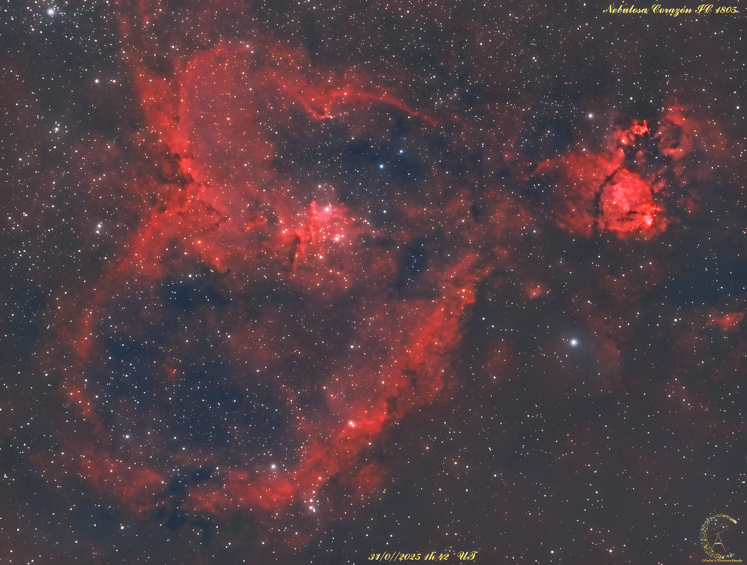 Hola, este es un objeto al que le tenía ganas pues antes con el 200/1000 no me cabía, pero con este 80/400 me entra, justito, pero entra, tarde en empezar la sesión pues a la altura que va me lo tapaban unos arboles y tuve que esperar, IC 1805 es una gran nebulosa de emisión que parece un corazón humano, de ahí su nombre, brilla en rojo debido al hidrógeno, en el centro hay un cúmulo de estrellas jóvenes conocido como Melotte 15, que están erosionando varios pilares de polvo con su luz y su viento, esta nebulosa se encuentra a unos 7500 AL de distancia y se localiza cerca de Casiopea, arriba a la derecha también aparece la nebulosa del ojo de pescado, tiene un tamaño de casi 300 años de luz, esta es la primera vez que le tiro a este objeto, espero que os guste.