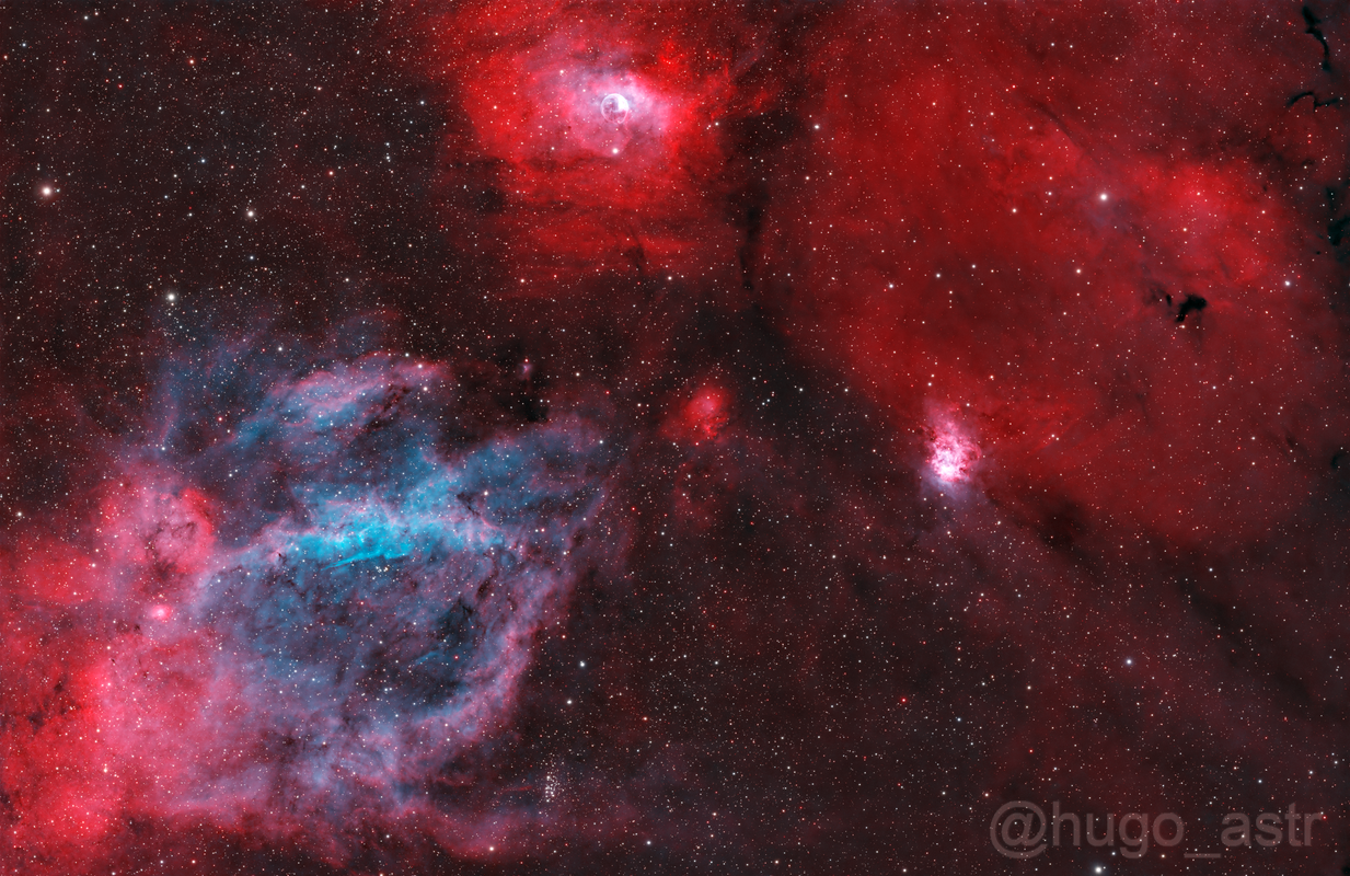 Por una parte estoy bastante satisfecho con el procesado pero por otra estoy un poco decepcionado con la región en general, esperaba que la señal de Sii del fondo se pareciese en intensidad a la que se puede ver en la nebulosa Pinza de Langosta abajo a la derecha. Este es mi proyecto más largo, con 51h (