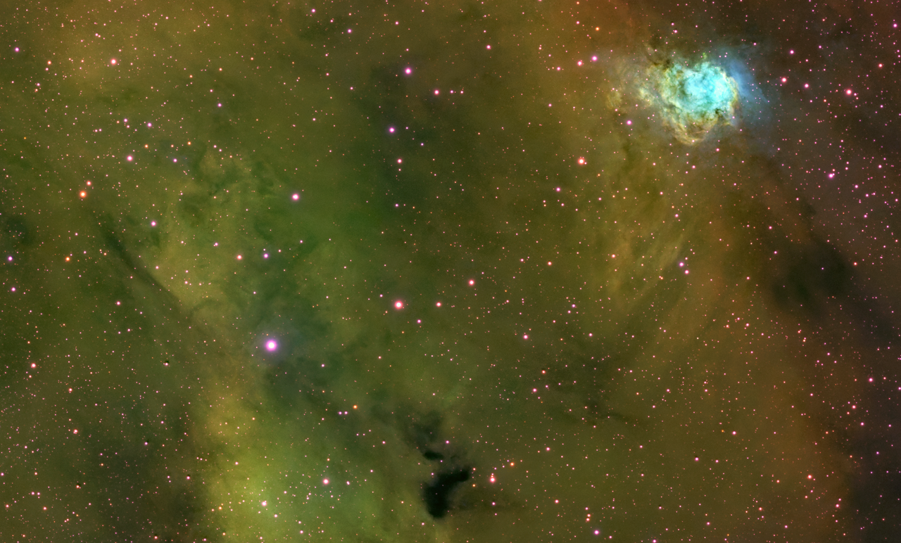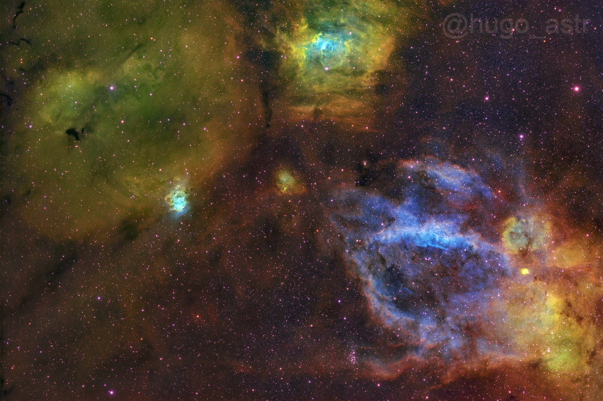 A mi la paleta SHO con su verde tradicional me gusta bastante. Sin embargo lo que no me convencen son las estrellas magenta. Me gustan los colores originales de las estrellas rojas amarillas azules y blancas sobre el fondo SHO. Por eso con frecuencia hago pequeñas tomas en RGB sin luminancia solo para poder poner estrellas RGB. En algunas ocasiones, cuando las estrellas de la zona son poco coloridas uso el scrip de Seti Astro para transformar las estrellas SHO en RGB y va bien. Sin embargo, como en el caso de madaleno coincido en que si te gustan en magenta no tienes por que cambiarlas. Asi la imagen se ve muy bien y el que mas la tiene que disfrutar es el que le ha dedicado tiempo y esfuerzo.