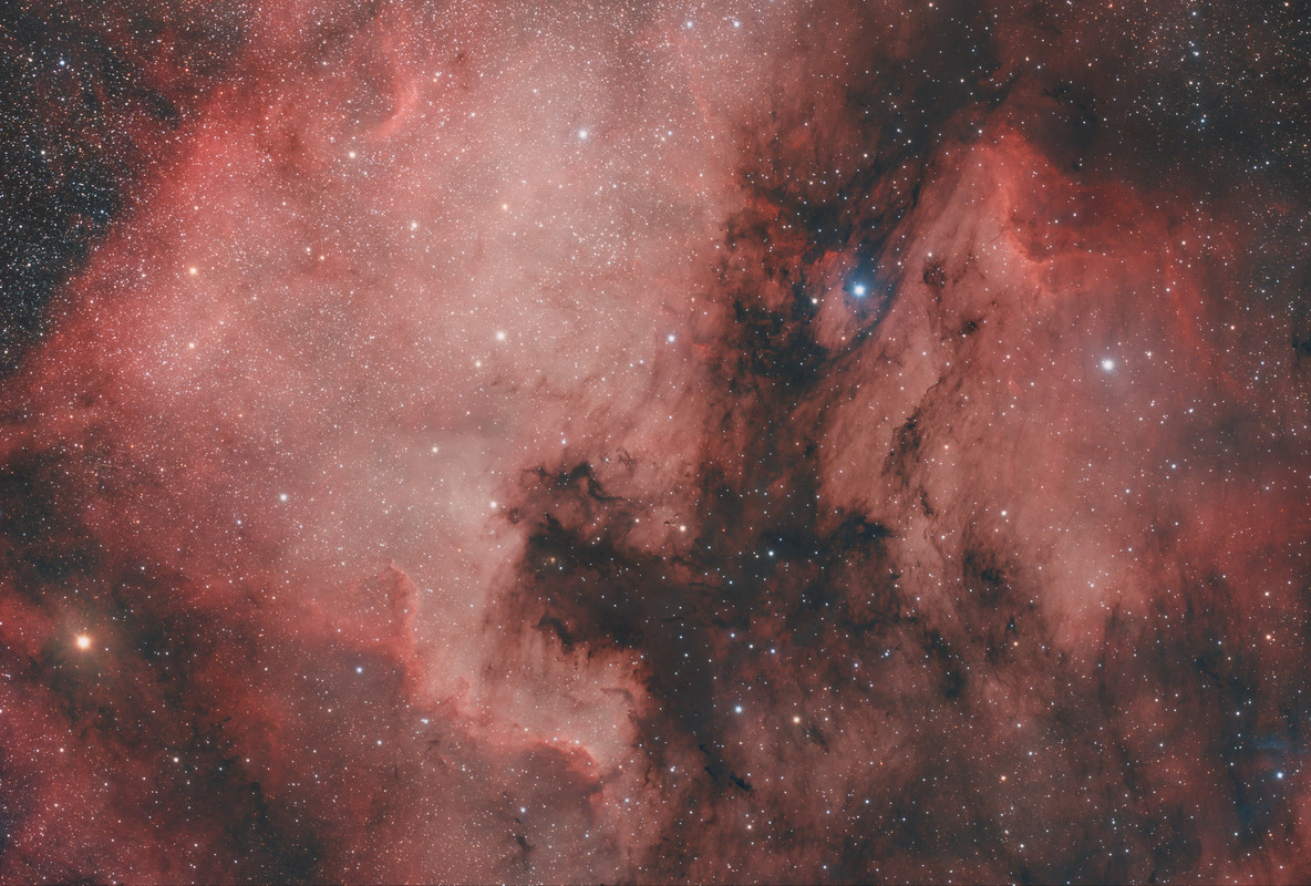 Ya hice una imagen de la NGC 7000 pero hace poco roté la cámara del RASA (algo bastante farragoso, sobre todo si hace tiempo que no se toca el tren óptico) para intentar que la parte larga del sensor coincidiera en este-oeste y así poder registrar mejor las colas de los cometas.