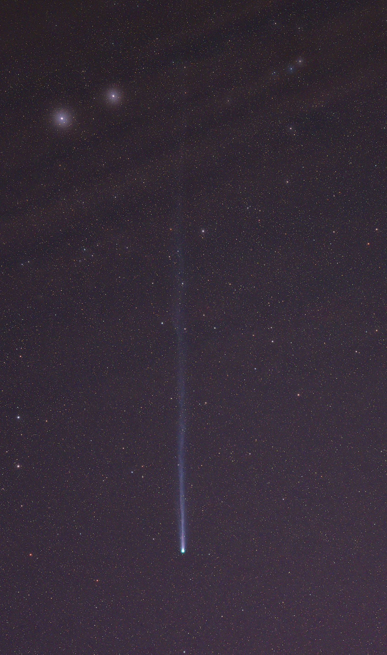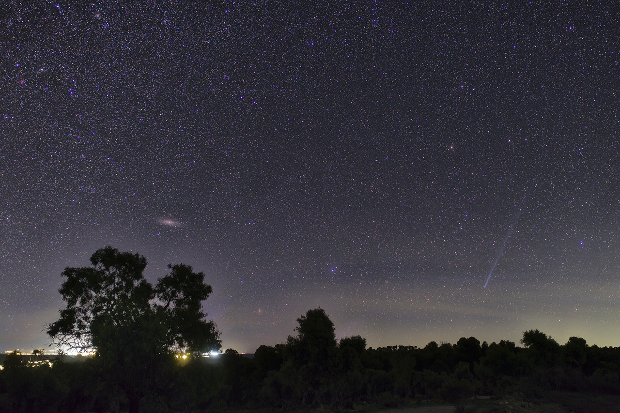 Del dia 15 de Abril con un objetivo de 35 mm y una Canon 6D. Son 80 imagenes de 10'', en este caso entra en el campo la galáxia de Andrómeda, la cola del cometa aunque débil en su parte final supera los 15º