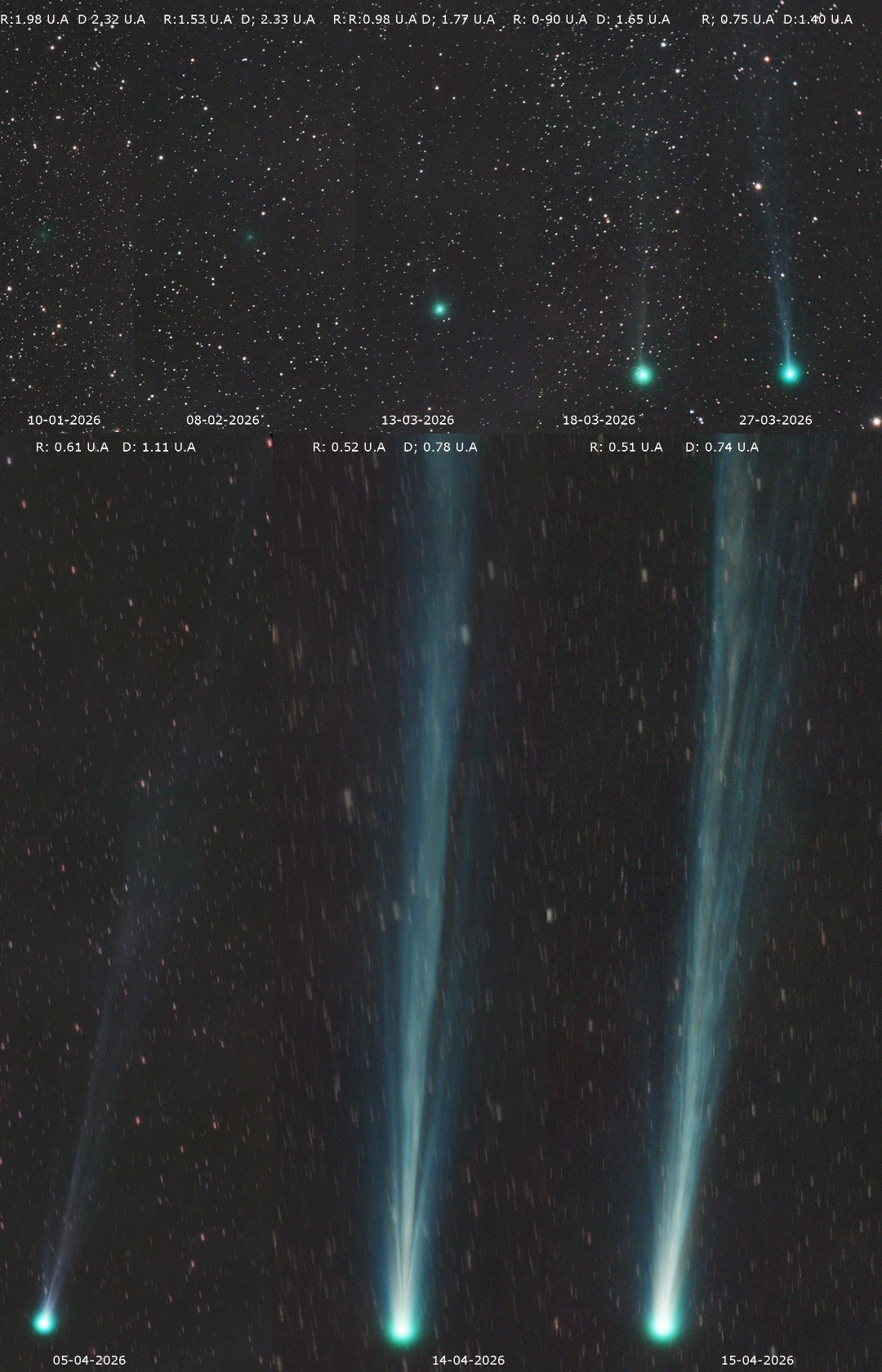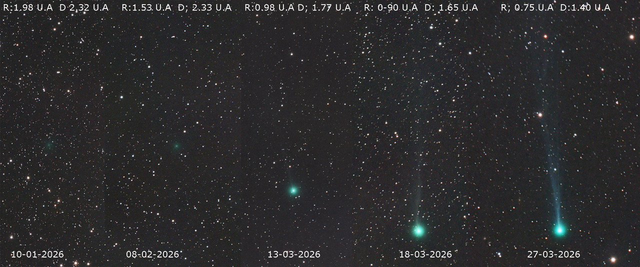 El montaje de imágenes es muy interesante y qué bien se aprecia la evolución del cometa a lo largo del tiempo.