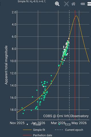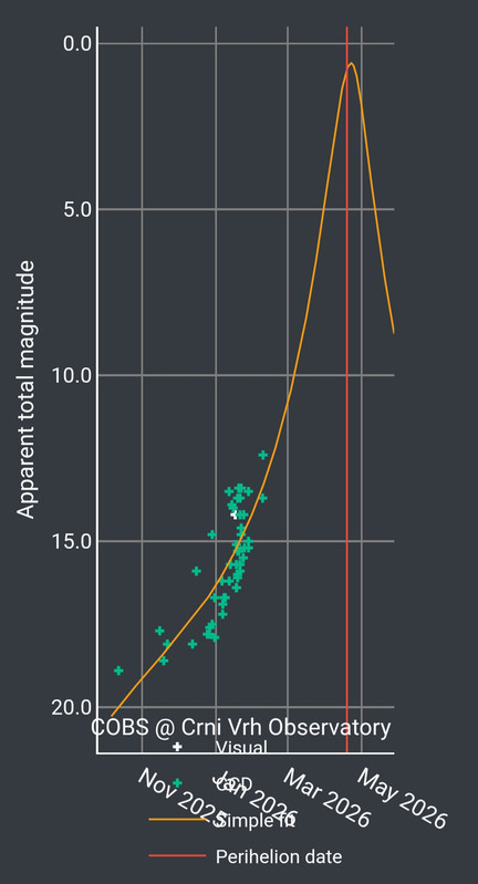 Como he comentado varias veces este tipo de cometas gaseosos suelen reducir su incremento de luz hacia las 1'2 U.A por lo que es poco probable que llegue a magnitud 0 como indican las curva de luz, aunque no seria descartable que llegara a la magnitud 3 o incluso la 2 durante el perihelio