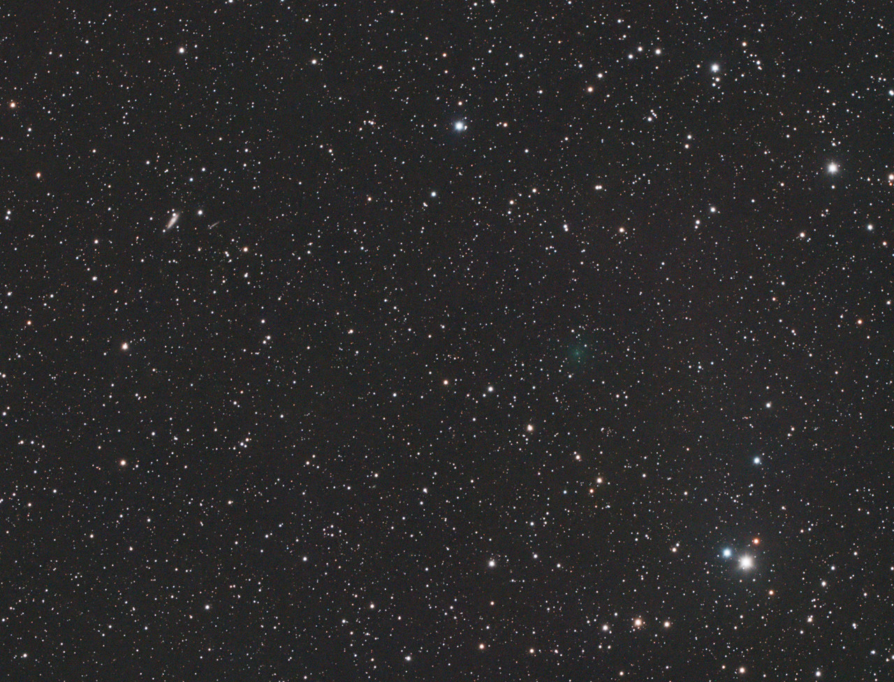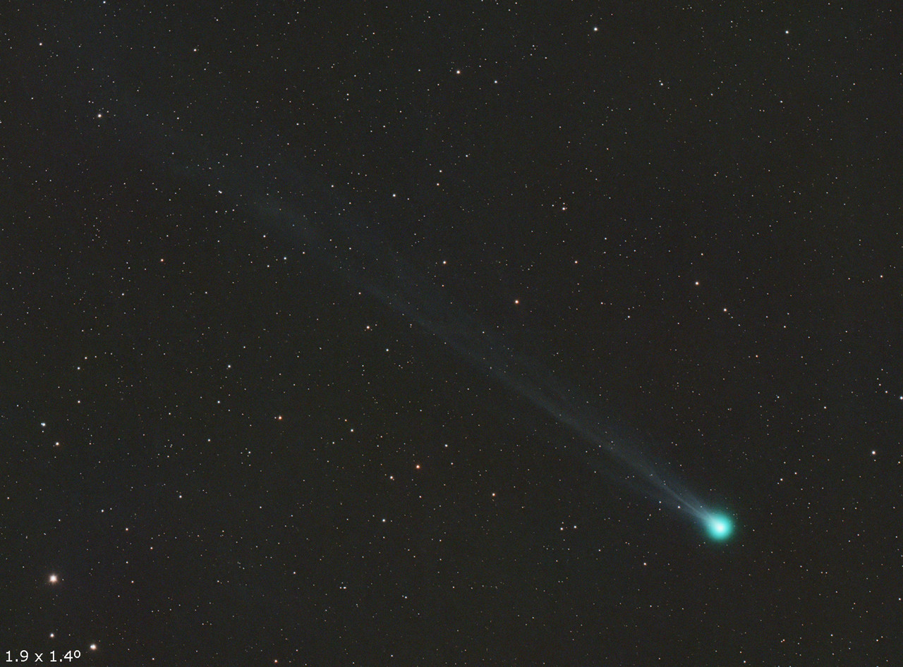 El cometa está más brillante que en mi observación del día 22, con una cola iónica que va ganando estructura y supera los 2º. Todo y que está cerca de cruzar la órbita de Venus, por ahora no se nota la formación de la cola de polvo, con una evolución muy similar al C/2023 P1 Nishimura.