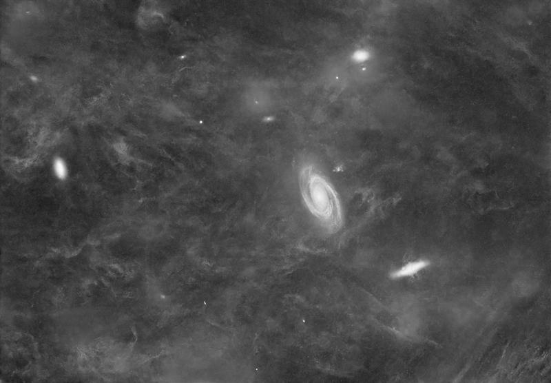 Se ve IFN a mansalva por toda la zona. Es abrumador. Como se notan esos cielos tan buenos. Si que me sorprende un poco que la zona del estallido de hidrógeno en M 82 no destaca tanto como hubiera esperado. ¿ Tal vez todo ese IFN capturado esté de algún modo tapando la señal de hidrógeno alfa?