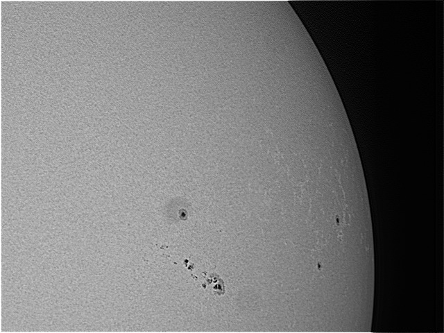 Hoy he tomado un par de imágenes solares. Como fotógrafo puedo ser mediocre (aún siendo optimista), pero procesando dejo mucho que desear. Ambas imágenes han sido tomadas con luz blanca, una lámina de Baader pegada a un cartón. He usado mi vieja DMK21 monocromática y un TSA102s. Las tomas han sido enfocadas de mala manera, pues ni con el brillo de la pantalla al máximo he sido capaz de ver nada, encandilado por la luz del Sol rebotando en el teclado plateado del portátil. La próxima vez intentaré que me coincida alguna sombra sobre él o buscaré la forma de colocarle una sombrilla. Además hace ya bastante calor y me hubiera venido bien algún refrigerio a mano. Como podéis ver, a pesar de ser imágenes realizadas en luz blanca, ha salido bastante decente el granulado de la superficie y un grupo de fáculas (creo que lo son) a la derecha del disco.