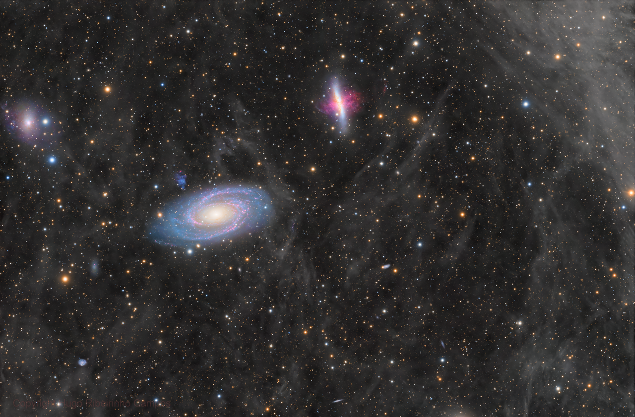 Hola a todos, después de un tiempo sin pasar por aquí vengo a compartir con vosotros mi imagen más reciente. Tenía ganas de hacer algo de banda ancha desde casa y como estamos en temporada de galaxias pues decidí ir a por las archiconocidas M81 y 82. La verdad es que estaba bastante oxidado en procesado LRGB, la imagen ha sido una pesadilla de procesar: la corrección de gradientes fue bastante fácil gracias al método MSGR (